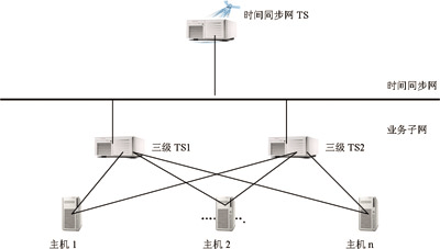 四川電信時間同步網(wǎng)對數(shù)據(jù)網(wǎng)元的授時,統(tǒng)一采用設(shè)置三級時間服務(wù)器方式。該方式須在數(shù)據(jù)網(wǎng)元內(nèi)部選定一臺或兩臺機(jī)器作為三級TS,三級TS同步到時間同步網(wǎng)的時間服務(wù)器,系統(tǒng)內(nèi)的其他主機(jī)與三級TS保持同步,如圖2所示。