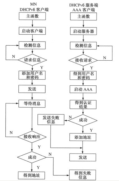 當DHCPv6服務器調用子進程執(zhí)行AAA客戶端程序后,AAA客戶端將把從MN傳過來的密碼和用戶名添加到認證請求選項中,向AAAL進行認證。AAAL將收到的消息轉發(fā)給AAAH服務器,AAAH收到認證請求后進行認證。如用戶名和密碼正確,則返回Accecpt響應消息,標志認證成功;如用戶名或者密碼錯誤,則返回Reject響應消息,標志認證失敗。AAAL收到認證回復消息后記錄認證信息,下次認證時只需詢問AAAL,減少認證步驟。