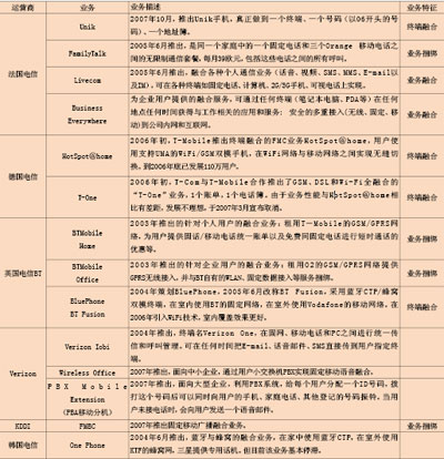 從全球范圍來看,大多數(shù)重要的固定運營商、移動運營商和綜合性運營商都已經(jīng)開始或計劃提供各種形式FMC業(yè)務(wù)(見表)。其中大多數(shù)運營商提供捆綁業(yè)務(wù)和簡單的融合業(yè)務(wù),而歐美的一些頂尖運營商已推出基于融合終端的FMC業(yè)務(wù)。