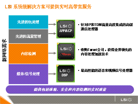LSI的高級通信處理器可實現(xiàn)出色的服務質量、高等級與流量管理能力,對于通過基于數(shù)據(jù)包的網(wǎng)絡交付像實時視頻這樣的新服務與服務而言,這些技術至關重要。由于網(wǎng)絡對高帶寬的需求越來越大,一般的網(wǎng)絡處理器可擴展性跟不上網(wǎng)絡的發(fā)展步伐。然而,LSI 的 NPU 則能將數(shù)據(jù)和控制路徑分開,更加有效地交付媒體流,從而保證了實時可靠性和真正的線速性能。這樣移動用戶可以享受到卓越的視頻質量。