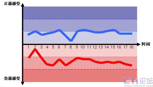 圖2的情感曲線分別是中國(guó)移動(dòng)的“喜愛”情感曲線和中國(guó)電信的“討厭”情感曲線,對(duì)應(yīng)于雙方整個(gè)呼入電話體驗(yàn)18個(gè)子流程上的情感感受。(注意,我們只列出了中國(guó)移動(dòng)的“喜愛”曲線和中國(guó)電信的“討厭”曲線來(lái)舉例說(shuō)明。)