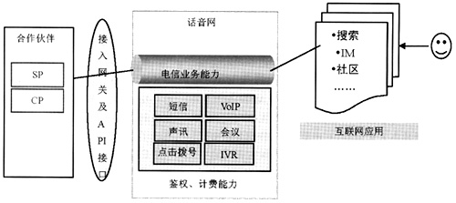 電信各種業(yè)務(wù)能力經(jīng)過封裝后以Web Services的方式向外開放,由互聯(lián)網(wǎng)應(yīng)用調(diào)用這些服務(wù)能力,提供基于互聯(lián)網(wǎng)的新型話音型業(yè)務(wù),互聯(lián)網(wǎng)應(yīng)用提供商作為SP與電信運(yùn)營商進(jìn)行收入分成,同時(shí)又有大量的CP作為新型話音應(yīng)用的內(nèi)容提供商加入價(jià)值鏈,運(yùn)營商在價(jià)值鏈上充當(dāng)主導(dǎo)作用。
