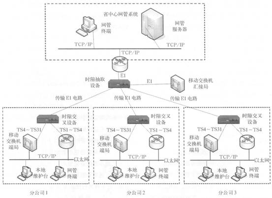 同樣以移動網(wǎng)為例,例子中移動交換機到維護(hù)終端支持TCP/IP方式,分公司具有本地維護(hù)終端和網(wǎng)管終端兩種類型的維護(hù)臺。本地維護(hù)終端通過以太交換機直接與移動交換機相連;網(wǎng)元和網(wǎng)管終端通過以太網(wǎng)接入邊緣路由器,經(jīng)路由器接.el轉(zhuǎn)化以El方式接入到時隙抽取設(shè)備中,由于傳送網(wǎng)管信息占用帶寬較小,