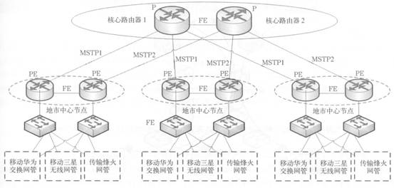 省中心核心節(jié)點配置兩臺高端路由器作為承載網(wǎng)的核心P路由器,同時配置兩臺高性能三層交換機作為PE設(shè)備,對省中心的各網(wǎng)管核心服務(wù)器進(jìn)行接入。
