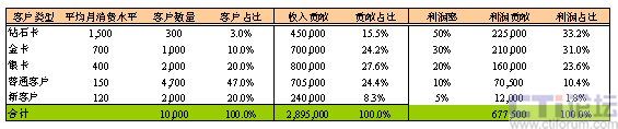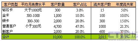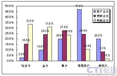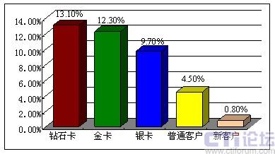 因?yàn)楦叨丝蛻粼诶麧欂暙I(xiàn)中所起的巨大作用,通過簡單的計(jì)算即可得出,每一名鉆石卡客戶流失帶來的利潤損失,相當(dāng)于9.4名銀卡客戶流失帶來的損失,或相當(dāng)于50名普通客戶流失帶來的損失,或相當(dāng)于125名新用戶流失帶來的直接損失。