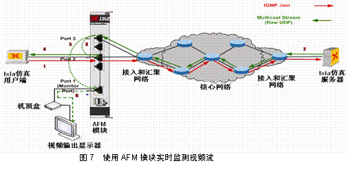 另外一種常見的應(yīng)用場景是對網(wǎng)絡(luò)中存在的IPTV組播流和單播流能夠進(jìn)行被動(dòng)實(shí)時(shí)監(jiān)測并能夠評(píng)估相應(yīng)視頻流的視頻質(zhì)量。IXIA獨(dú)特的視頻流提取模塊AFM支持該特性的測試(見圖6)。