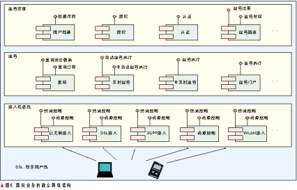 在圖1的網(wǎng)絡(luò)層次中,存在4種服務(wù)商角色:接入網(wǎng)提供商、業(yè)務(wù)網(wǎng)運(yùn)營商、業(yè)務(wù)提供商、聚合門戶網(wǎng)站。業(yè)務(wù)網(wǎng)運(yùn)營商可以在用戶簽約時提供多個業(yè)務(wù)提供者、聚合門戶網(wǎng)站的簽約選項(xiàng),用戶可以選擇在成為業(yè)務(wù)網(wǎng)運(yùn)營商的客戶的同時也成為多個感興趣的業(yè)務(wù)提供商的會員,后兩者可以訪問業(yè)務(wù)網(wǎng)運(yùn)營商的認(rèn)證、授權(quán)和計(jì)費(fèi)(AAA)基礎(chǔ)設(shè)施,從而對用戶身份進(jìn)行統(tǒng)一的認(rèn)證、授權(quán)和計(jì)費(fèi)。業(yè)務(wù)提供商和業(yè)務(wù)網(wǎng)運(yùn)營商之間的劃分可以采用結(jié)算制也可以采用批發(fā)業(yè)務(wù)的方式。