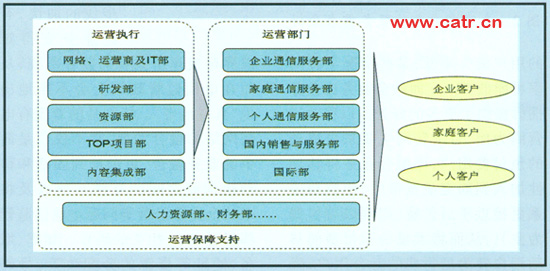 新型的融合產(chǎn)品和服務突破了原來的技術界限,如果還延續(xù)原有的按技術劃分的部門管理結構,必將產(chǎn)生過多的分支部門,造成企業(yè)結構龐雜、效率低下,對新的綜合服務的市場需求缺乏感受力,新服務無法及時推向市場的問題。因此,重新進行部門劃分,實現(xiàn)內(nèi)部的協(xié)調(diào)配合是十分必要的。而業(yè)務提供的融合性、多元化及客戶的統(tǒng)一服務需求,使這種組織結構的重新構建最終將以客戶為中心進行構建:在前端以客戶為中心劃分運營部門,實現(xiàn)對客戶的直接服務,在后端,以業(yè)務、運維等職責為中心部署組織結構,形成對運營執(zhí)行的支撐。