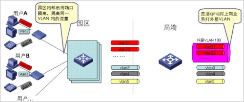 考慮到業(yè)務(wù)特性,上網(wǎng)業(yè)務(wù)通常需要對(duì)用戶(hù)進(jìn)行精細(xì)化管理,而對(duì)IPTV業(yè)務(wù)通常采用較粗獷的管理模式,因此我們建議通過(guò)如下方式來(lái)做VLAN規(guī)劃:對(duì)上網(wǎng)業(yè)務(wù),采用PUPV(每用戶(hù)一VLAN),對(duì)于IPTV/VOIP業(yè)務(wù),采用PSPV(每業(yè)務(wù)一VLAN),即同一園區(qū)內(nèi)的IPTV用戶(hù)采用同一VLAN,不同園區(qū)的IPTV/VOIP用戶(hù)采用不同的業(yè)務(wù)VLAN,在局端,通過(guò)靈活QINQ對(duì)上網(wǎng)業(yè)務(wù)的VLAN打外層標(biāo)簽,對(duì)于IPTV業(yè)務(wù)的VLAN不打外層標(biāo)簽。