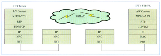 圖3是IPTV的傳播協議棧。語音視頻內容首先經過壓縮編碼(大多采用MPEG-2),然后使用實時傳輸協議(RTP)封裝,得到的載荷使用UDP或者TCP封裝成IP層的有效載荷,最后經過IP協議和以太網802.3協議封裝后在核心網絡中傳播。核心網邊緣的WiMAX基站在收到802.3協議包后,基站的MAC層解封裝該包,去除以太網協議頭,再封裝成802.16協議的MAC層分組數據單元和PHY層數據單元。物理層采用前向糾錯編碼(FEC)、符號映射和OFDM調制等技術為數據單元準備無線空中連接。無線電收發(fā)器通過天線再把信號發(fā)送給SS或BS。當SS和BS接收到信號后,通過上面過程的逆過程,把信號還原為用戶需要的語音視頻內容。