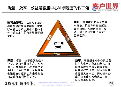 應(yīng)該說這三個方面是科學(xué)運(yùn)營的一個鐵三角,這是我們的理解,因為三角形,始終認(rèn)為是最穩(wěn)定、簡單、有效的圖形,也是我們在進(jìn)行內(nèi)部運(yùn)營的管理鐵架。質(zhì)量是客服中心最大的觸點當(dāng)中被客戶感知,從而帶來客戶忠誠的,如何管理質(zhì)量,那就至關(guān)重要。效率尤其是規(guī)模型的呼叫中心的運(yùn)營好壞,是與生產(chǎn)力的發(fā)展強(qiáng)相關(guān),而科技解放生產(chǎn)力是解決規(guī)模問題的關(guān)鍵。技術(shù)不僅是運(yùn)行更具效益率,同時還對企業(yè)的決策作出預(yù)先準(zhǔn)備,而不僅僅是事后反應(yīng)。很多年來,更多的企業(yè)是把客服中心視為成本中心,而事實上,效益的顯現(xiàn)讓我們陸續(xù)地走出了成本中心,它應(yīng)該是公司接觸客戶、挖掘客戶、挽留客戶、改進(jìn)客戶關(guān)系的一個最好工具,是用服務(wù)創(chuàng)造更有價值的客戶,來達(dá)到公司最終增加利潤的目標(biāo)。