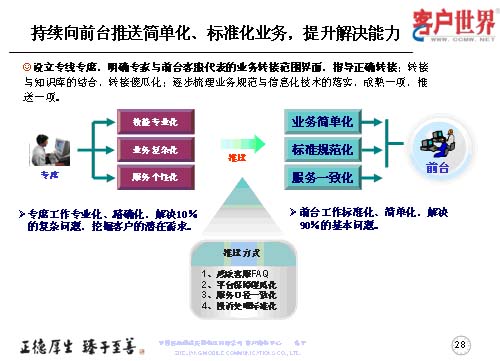 設(shè)立專線專席,并不是指專線越專越多,而是持續(xù)地向前臺推送簡單化、標(biāo)準(zhǔn)化的業(yè)務(wù),提升前臺一線的解決能力,所以我們重點以專線的技能專業(yè)化、業(yè)務(wù)復(fù)雜化、服務(wù)個性化,然后把簡單的形成規(guī)范標(biāo)準(zhǔn)的業(yè)務(wù)向前臺推送,保障專席的工作是專業(yè)化、精確化地解決10%的復(fù)雜問題,從而更多地去挖掘客戶的需求。而前臺客服的工作是用標(biāo)準(zhǔn)化、簡單化地解決90%的基本問題。