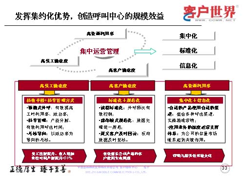 作為集中管理來講,突出“三高”,運(yùn)用好“三高”體現(xiàn)的是如何進(jìn)行集中化、標(biāo)準(zhǔn)化和信息化。我們從高員工滿意度,高客戶滿意度和高資源利用率入手,高員工滿意度主要是應(yīng)用平臺和科學(xué)的管理方法,使得員工的技能持續(xù)提升,員工的自身收入也按單位時間而增長;高客戶滿意度是用標(biāo)準(zhǔn)化和規(guī)范化來進(jìn)一步優(yōu)化流程,改進(jìn)操作,對于目標(biāo)客戶及時回訪,有效地延長公司產(chǎn)品的客戶使用生命周期,以創(chuàng)造公司的最大利益;作為集中化的呼叫中心,系統(tǒng)已經(jīng)投入了較大的座席規(guī)模,高資源利用率是如何把這些座席和系統(tǒng)的規(guī)模應(yīng)用得更好,使得我們的產(chǎn)品能夠進(jìn)一步地推向市場,被客戶所接受,所以我們采取了更多的整合呼出渠道,精確營銷,尤其對公司的存量客戶進(jìn)行持續(xù)維系的關(guān)鍵時刻,達(dá)到營銷與服務(wù)效率的最大化。