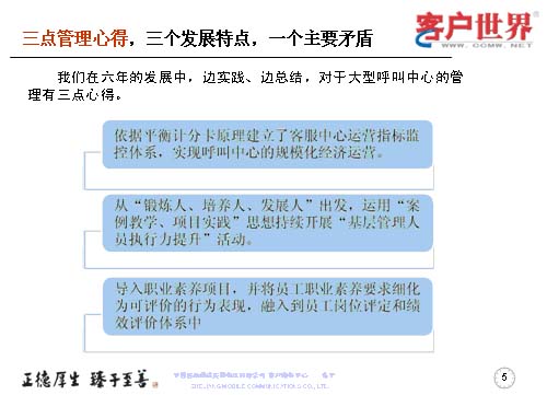 在這六年中,我們有三點管理心得,三個發(fā)展特點,一個主要矛盾。我們邊實踐邊總結(jié),對大型呼叫中心運(yùn)營的管理有三點心得: