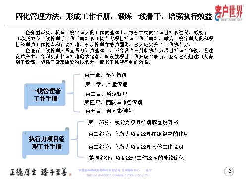 固化了管理方法以后就形成了工作手冊,在全面寫實、梳理一線管理人員工作的基礎(chǔ)上,結(jié)合主要的管理目標(biāo)和過程,形成《客服中心一線管理者工作手冊》和《執(zhí)行力項目經(jīng)理工作手冊》,作為一線管理人員和項目經(jīng)理的工作指南和行動標(biāo)準(zhǔn),予以管理方法的固化,極大地提高了工作執(zhí)行力。而在一線管理人員全員培訓(xùn)的基礎(chǔ)上,專設(shè)“三月制執(zhí)行力項目經(jīng)理崗位”,通過競聘產(chǎn)生,專職負(fù)責(zé)管理標(biāo)準(zhǔn)落實督察,階段性地項目開展,至今有50多人得到鍛煉,由此帶來了項目經(jīng)理本人和企業(yè)意想不到的效益。