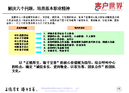 一線客服人員如何來全面提升職業(yè)能力,首先是解決一線客服人員的六個問題,剛才已經(jīng)跟大家交流了客服中心一線人員的人員結(jié)構(gòu),當(dāng)前的六個主要問題可以用簡單的幾個方面來表述:對生活沒有明確的目標(biāo)、對自己不進(jìn)取、對工作不負(fù)責(zé)、對同事不合作、對顧客不關(guān)心、對企業(yè)不忠誠,這是在日常工作中,一線人員所存在的問題。而針對這些問題,我們要用工作目標(biāo)去持續(xù)解決和克服問題,所以我們采取的是讓大家明確企業(yè)目標(biāo)與個人使命,用積極的心態(tài)自主自發(fā),主動積極和個人領(lǐng)導(dǎo);良好的工作態(tài)度責(zé)任心,良好的團(tuán)隊合作氛圍;熟練掌握溝通技巧和方法,牢固樹立顧客滿意的意識,以客為尊;良好的行為素質(zhì)習(xí)慣,自我學(xué)習(xí),終身學(xué)習(xí)。從而在中國移動集團(tuán)“正德厚生、臻于至善”的核心價值觀指導(dǎo)下,結(jié)合呼叫中心特點,確定誠實務(wù)信,愛崗敬業(yè),以客為尊、團(tuán)隊合作的團(tuán)隊文化。