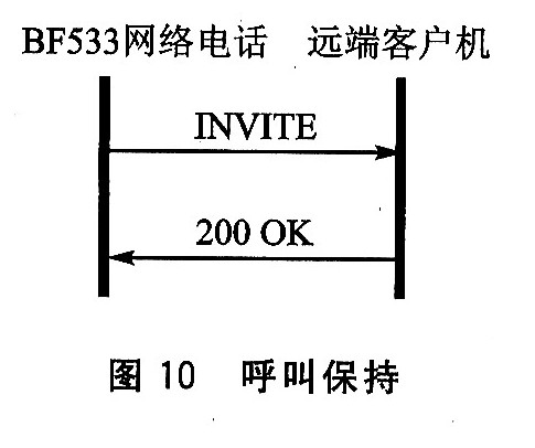 BF533網(wǎng)絡(luò)電話遠(yuǎn)端客戶機(jī)遠(yuǎn)端各尸機(jī)回復(fù)200 0K接受保持,如圖10所示。同理,呼叫恢復(fù)就是將c參數(shù)恢復(fù)原值,過(guò)程與呼叫保持相同。