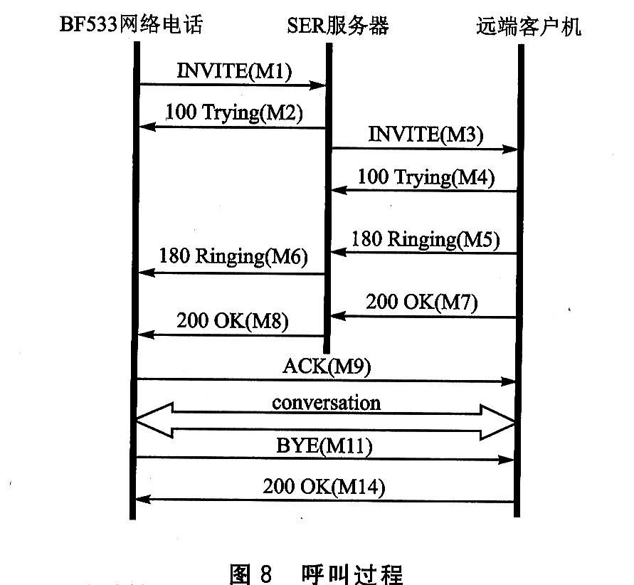 呼叫過(guò)程如圖8所示。BF533網(wǎng)絡(luò)電話(BP)先是向SER服務(wù)器發(fā)送了一條INⅥTE消息(M1),要求與遠(yuǎn)端客戶機(jī)(RC)進(jìn)行對(duì)話。SER馬上回復(fù)一條100