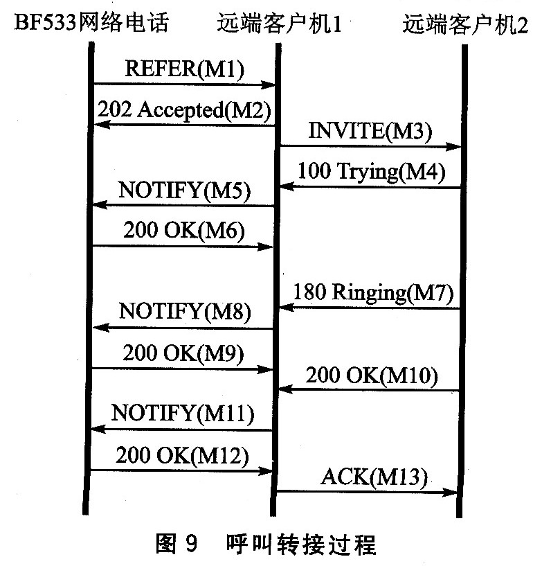 該過(guò)程是通過(guò)擴(kuò)展的SIP信令REFER來(lái)完成的,交互過(guò)程如圖9所示。當(dāng)BF533網(wǎng)絡(luò)電話要將它和遠(yuǎn)端客戶機(jī)1(RCl)的通話轉(zhuǎn)接到遠(yuǎn)端客戶機(jī)2(RC2)時(shí),BF發(fā)送REFER(M1)給RCl,該信息中Refer—To字頭標(biāo)明了RC2的URL,之后RCl回復(fù)202