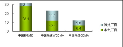 在3G設(shè)備市場(chǎng)方面,2008年,中國的WCDMA、CDMA2000與TD-SCDMA三種3G網(wǎng)絡(luò)在建設(shè)上有不同的進(jìn)展。中國移動(dòng)啟動(dòng)了第二階段的TD-SCDMA網(wǎng)絡(luò)建設(shè)、中國電信啟動(dòng)了涉及面向81個(gè)重點(diǎn)城市的CDMA全網(wǎng)招標(biāo)、而中國聯(lián)通也開始7個(gè)城市建立WCDMA試驗(yàn)網(wǎng)絡(luò)的建設(shè)工作。而在所有的網(wǎng)絡(luò)建設(shè)中,中國本土廠商借3G契機(jī)迅速提升競(jìng)爭力,占據(jù)了3G網(wǎng)絡(luò)建設(shè)大部分市場(chǎng)份額。