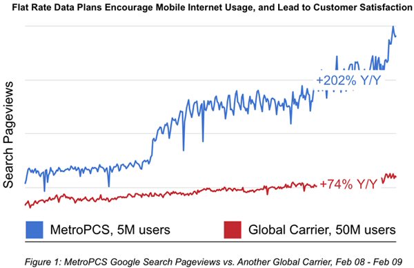 這里以美國一家地區(qū)性的小運營商MetroPCS為例,MetroPCS的CDMA用戶數(shù)剛超過500萬。在過去的一年里,MetroPCS的Google搜索量增長了2.5倍。而這個數(shù)字,是那些全球性的、擁有大量用戶和3G網(wǎng)絡(luò)運營商的10倍。
