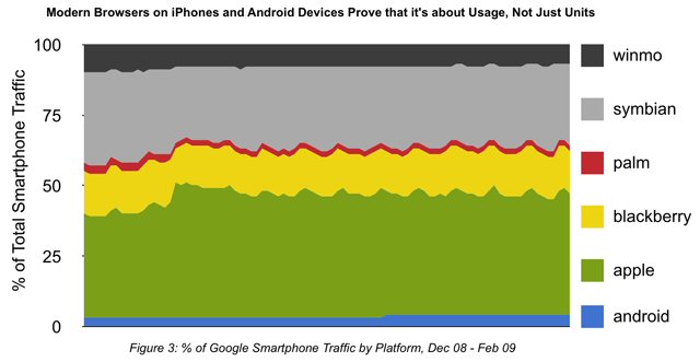 這里有個例子:iPhone、Android手機雖然僅占到智能手機市場份額的13%,卻貢獻(xiàn)了50%的智能手機Google搜索流量(Google訪問)。