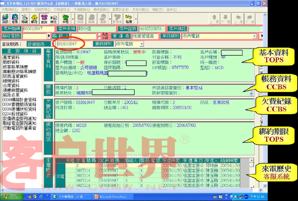 我們推動「CPEP客服流程提升計劃」的重點是在IVR流程中就請客戶自行輸入其欲查詢或辦理的電話號碼,同時客服系統(tǒng)便先透過EAI到后端信息系統(tǒng),查詢出該號碼的核心數(shù)據(jù)(含基本、帳務(wù)、欠費記錄、來電歷史等),當(dāng)客服人員應(yīng)答時客服系統(tǒng)便立即將這些核心數(shù)據(jù)顯示在屏幕上(如圖一),客服人員便可立即掌握此客戶之相關(guān)資料,CPEP如此改善后平均的服務(wù)效率提升了11%。