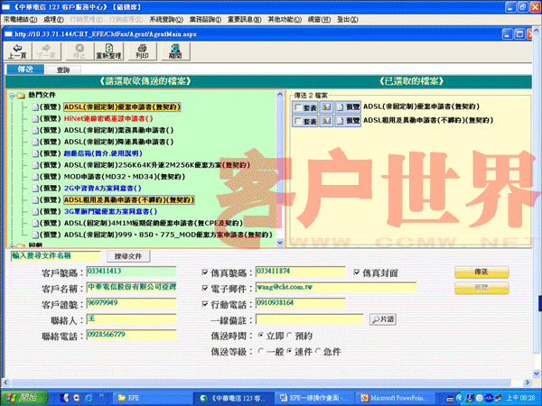 EFE第一步先將所有的窗口、文件與數(shù)據(jù)轉(zhuǎn)為電子化的檔案,當(dāng)需要傳送書面文件給客戶時,客服人員可立即在在線點選以傳真或電子郵件將文件傳給客戶(如圖二),傳送成功后并立即以SMS通知客戶。當(dāng)客戶反饋數(shù)據(jù)回來時,EFE會自動接收并存盤,接收成功后EFE則會立即發(fā)送SMS訊息給客戶安心,而且所有送出與接收文件都有完整記錄可共管理、追蹤與處理。
