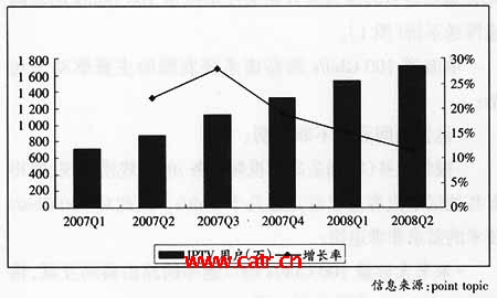 Play業(yè)務(wù),AT&T、Verizon等電信運(yùn)營(yíng)商也積極開展IPTV業(yè)務(wù),并且用戶規(guī)模迅速增長(zhǎng),截至2008年第二季度,美國(guó)的IPTV用戶達(dá)到249萬。亞太各個(gè)國(guó)家和地區(qū)的IPTV業(yè)務(wù)發(fā)展情況差異很大,中國(guó)香港的PCCW是目前IPTV用戶規(guī)模最大的電信運(yùn)營(yíng)商,截至2008年第二季度,PCCW的IPTV業(yè)務(wù)“now