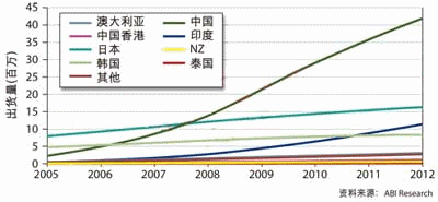 圖1:根據(jù)國家和地區(qū)細分的2005年到2012年亞太區(qū)家庭網(wǎng)絡(luò)發(fā)展趨勢