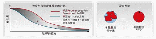 為了向聯(lián)網(wǎng)家庭提供強大的無線骨干網(wǎng),Broadcom利用Acclerange技術(shù)對其新的802.11n路由器平臺作了全面優(yōu)化,其軟硬件增強性能確保了家庭中任一角落的更健壯的無線覆蓋。Accelerange軟件架構(gòu)還支持時空分組編碼(STBC)技術(shù),采用了獨特的2×2天線結(jié)構(gòu),從而能以盡可能低的成本提供更好的性能。它的非線性均衡器只需要兩個,而65nm工藝的集成更是有助于進一步降低成本。另外,基于Accelerange的解決方案針對視頻分發(fā)和其他多媒體應用作了優(yōu)化,其內(nèi)置算法可以檢測多媒體數(shù)據(jù)流,并通過動態(tài)調(diào)整來實現(xiàn)最優(yōu)性能。經(jīng)認證的動態(tài)頻率選擇(DFS)技術(shù)還可以在5GHz頻段內(nèi)增加15個信道。