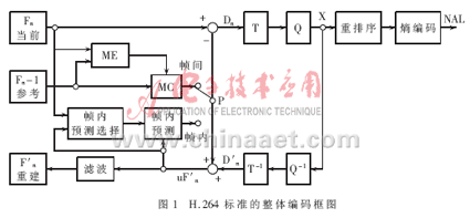 Abstraction Layer),負(fù)責(zé)對(duì)數(shù)據(jù)進(jìn)行打包和傳送。H.264編碼圖像通常分為三種類型:I幀、P幀、B幀。I幀為幀內(nèi)編碼幀,其編碼不依賴于已編碼的圖像數(shù)據(jù)。P幀為前向預(yù)測(cè)幀,B幀為雙向預(yù)測(cè)幀,編碼時(shí)都需要根據(jù)參考幀進(jìn)行運(yùn)動(dòng)估計(jì)。同時(shí),H.264在提高圖像傳輸容錯(cuò)性方面做了大量工作,重新定義了適于圖像的結(jié)構(gòu)劃分。在編碼時(shí),圖像幀各部分被劃分到多個(gè)Slice結(jié)構(gòu)中,每個(gè)Slice都可以被獨(dú)立編碼,不受其他部分影響。Slice由圖像最基本的結(jié)構(gòu)——宏塊組成,每個(gè)宏塊包含一個(gè)16×16的亮度塊和兩個(gè)8×8的色度塊。H.264標(biāo)準(zhǔn)的整體編碼框圖如圖1所示。編碼過(guò)程中,原始數(shù)據(jù)進(jìn)入編碼器后,當(dāng)采用幀內(nèi)編碼時(shí),首先選擇相應(yīng)的幀內(nèi)預(yù)測(cè)模式進(jìn)行幀內(nèi)預(yù)測(cè),隨后對(duì)實(shí)際值和預(yù)測(cè)值之間的差值進(jìn)行變換、量化和嫡編碼,同時(shí)編碼后的碼流經(jīng)過(guò)反量化和反變換之后重構(gòu)預(yù)測(cè)殘差圖像,再與預(yù)測(cè)值相加得出重構(gòu)幀,得出的結(jié)果經(jīng)過(guò)去塊濾波器平滑后送入幀存儲(chǔ)器。采用幀間編碼時(shí),輸入的圖像塊首先在參考幀中進(jìn)行運(yùn)動(dòng)估計(jì),得到運(yùn)動(dòng)矢量。運(yùn)動(dòng)估計(jì)后的殘差圖像經(jīng)整數(shù)變換、量化和嫡編碼后與運(yùn)動(dòng)矢量一起送入信道傳輸。同時(shí)另一路碼流以相同的方式重構(gòu)后,經(jīng)去塊濾波后送入幀存儲(chǔ)器作為下一幀編碼的參考圖像。