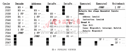 VIEWER工具,如圖4所示。在編寫(xiě)完成匯編代碼后,可使用該工具觀察運(yùn)行時(shí)流水線的情況。如果有stall等出現(xiàn),會(huì)給出原因,優(yōu)化人員根據(jù)工具分析結(jié)果重新更改代碼,提高執(zhí)行效率。