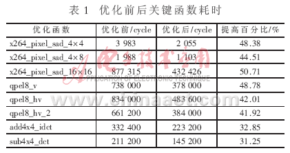 和SRAM 進(jìn)行擴(kuò)展,可以訪問(wèn)多達(dá)132 MB的物理存儲(chǔ)器。根據(jù)這樣的特點(diǎn),將執(zhí)行率更高的代碼放入L1指令緩存中,能使代碼更快地運(yùn)行。IDE提供了Profile工具,能在運(yùn)行時(shí)統(tǒng)計(jì)各個(gè)函數(shù)所占的CYCLE數(shù)和占總CYCLE數(shù)的百分比。通過(guò)將X264中比較耗時(shí)的部分算法代碼,如模式選擇部分代碼放入L1指令空間,能進(jìn)一步提升運(yùn)行效率。Profile工具統(tǒng)計(jì)結(jié)果同樣也是選擇需要使用匯編優(yōu)化函數(shù)的依據(jù),IDE可根據(jù)Profile結(jié)果對(duì)代碼進(jìn)行優(yōu)化。X264代碼Profile統(tǒng)計(jì)結(jié)果與測(cè)試數(shù)據(jù)有很大關(guān)系,選用更類似以后應(yīng)用場(chǎng)所的數(shù)據(jù)作為測(cè)試數(shù)據(jù),能使統(tǒng)計(jì)結(jié)果更接近以后的應(yīng)用環(huán)境。為達(dá)到比較準(zhǔn)確的統(tǒng)計(jì)結(jié)果,最好在Simulation階段進(jìn)行統(tǒng)計(jì)。雖然這樣非常耗時(shí),但為得到一個(gè)準(zhǔn)確的統(tǒng)計(jì)作為參考依據(jù)是值得的。此外CACHE