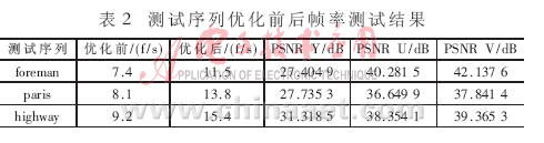 對(duì)三種測(cè)試序列在總線頻率120MHz下進(jìn)行優(yōu)化前后幀率測(cè)試,結(jié)果如表2所示。從表2可以看出,采用以上優(yōu)化方法能顯著提高幀率。