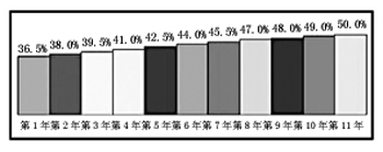 除了分檔包月的語音套餐,KDDI還根據(jù)消費(fèi)者的不同需求提供了多樣折扣優(yōu)惠,其中包括在網(wǎng)時(shí)長優(yōu)惠、家庭優(yōu)惠、個(gè)人優(yōu)惠、學(xué)生優(yōu)惠等多種方式(圖1)。多樣優(yōu)惠折扣方式之間也可以通過組合產(chǎn)生新的優(yōu)惠折扣內(nèi)容。例如:在網(wǎng)時(shí)長優(yōu)惠與家庭優(yōu)惠共享的套餐在入網(wǎng)的第1年優(yōu)惠折扣達(dá)到40%,此后每續(xù)約1年將增加1%的折扣優(yōu)惠,逐年累積下來,在第11年將享受高達(dá)50%的優(yōu)惠折扣(圖2)。時(shí)段優(yōu)惠套餐中體現(xiàn)分時(shí)段優(yōu)惠,區(qū)分忙時(shí)、閑時(shí),周末時(shí)間和工作時(shí)間,分別定價(jià)。例如,同樣是9500日元的套餐檔次,在時(shí)段優(yōu)惠套餐中,周末白天(閑時(shí))的資費(fèi)是每分鐘10日元,而在非時(shí)段優(yōu)惠的普通套餐中,每分鐘的資費(fèi)是24日元,可見在網(wǎng)絡(luò)閑時(shí)可以享受更多的資費(fèi)優(yōu)惠。而針對(duì)學(xué)生和老人設(shè)計(jì)的套餐也能享受比普通套餐更優(yōu)惠的資費(fèi),這就體現(xiàn)了區(qū)別細(xì)分市場的差異化定價(jià)。