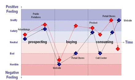 看一看“情感曲線”也許你就會(huì)頓悟。此處所示的兩條曲線來(lái)自兩個(gè)國(guó)際銀行。請(qǐng)注意曲線的不同之處。紅線所示的銀行與藍(lán)線所示的銀行相比在呼叫中心服務(wù)和店內(nèi)體驗(yàn)上都要略勝一籌。而藍(lán)線所示銀行在網(wǎng)上銀行這一項(xiàng)上表現(xiàn)更好!凹t線”銀行的競(jìng)爭(zhēng)資本是其卓越的客戶互動(dòng)體驗(yàn),無(wú)論是分行的面對(duì)面互動(dòng)還是來(lái)自聯(lián)絡(luò)中心的遠(yuǎn)程體驗(yàn)都屬一流。