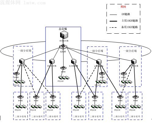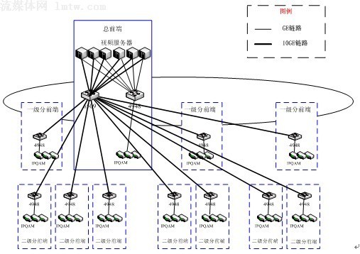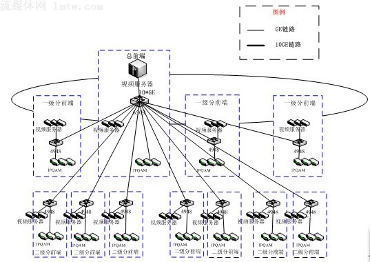 方案二:全集中式。在總前端集中部署若干臺(tái)視頻服務(wù)器,通過萬(wàn)兆網(wǎng)絡(luò)直接向各分前端提供視頻流服務(wù);示意圖如下: