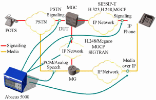 例如,運營商在部署VoIP網(wǎng)絡(luò)時,有可能會采用A廠家的軟交換和B廠家的接入網(wǎng)關(guān)設(shè)備,如何確認這兩家的設(shè)備在一起互通時沒有性能上的問題?這時可以采用儀表仿真接入網(wǎng)關(guān)下面的模擬線終端,往網(wǎng)關(guān)和軟交換側(cè)發(fā)起呼叫,再由軟交換將呼叫路由回網(wǎng)關(guān)再到終端。通過這種方式,由儀表發(fā)起成千上萬的呼叫經(jīng)過接入網(wǎng)關(guān)和軟交換,可以有效地驗證這兩種設(shè)備在互通的時候有沒有性能和穩(wěn)定性問題。