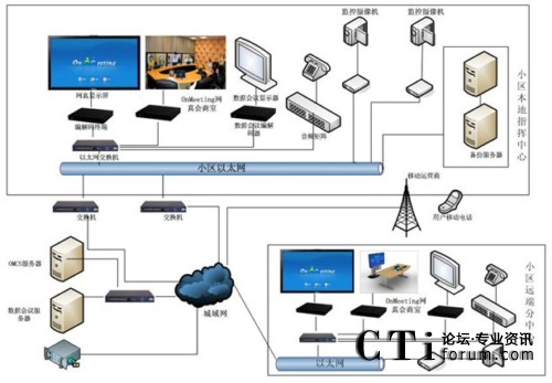 Communication Server)服務(wù)器,實(shí)現(xiàn)OnMeeting網(wǎng)真預(yù)約會議、數(shù)據(jù)協(xié)同以及即時通信功能,使得網(wǎng)真視頻會議與社區(qū)管理中原有辦公和監(jiān)控系統(tǒng)有機(jī)的融合,提供了高清晰、高效率、1:1真人大小圖像的視頻通信,使得社區(qū)安防會商實(shí)現(xiàn)了更有效的溝通。