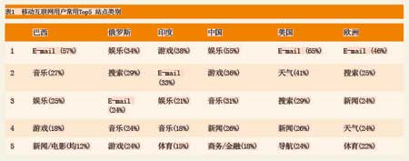 美國用戶五大類熱門應(yīng)用依次是E-mail、天氣、搜索、新聞、導(dǎo)航。