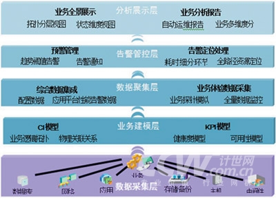 業(yè)務(wù)建模層: 是整個監(jiān)控系統(tǒng)的核心,是將業(yè)務(wù)進行有形化管理、量化衡量的高效手段。該業(yè)務(wù)建模層中涵蓋了幾乎所有的BOSS管理資源要素,包括業(yè)務(wù)、應(yīng)用、服務(wù)及其他平臺類資源,這些信息都建立并實時更新于企業(yè)集中建設(shè)的符合ITIL標準的CMDB(配置資源數(shù)據(jù)庫,其中每一子項便是一個CI配置資源項)中;贑MDB中動態(tài)調(diào)整的實時CI項和相互關(guān)系,關(guān)聯(lián)上能夠反映業(yè)務(wù)當(dāng)前狀況的KPI指標,以結(jié)構(gòu)化的模型框架為指導(dǎo),建立完整的業(yè)務(wù)CI/KPI指標體系,繪制出以業(yè)務(wù)為中心的BOSS系統(tǒng)視圖,全面展現(xiàn)其健康度和可用性。