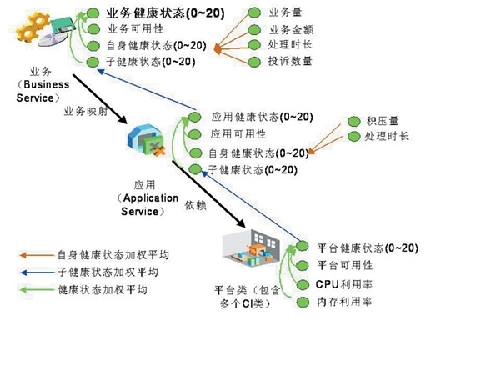 CI/KPI模型的建立,成功地將傳統(tǒng)監(jiān)控系統(tǒng)的監(jiān)控難點轉(zhuǎn)變?yōu)榱咙c,通過對模型中父子業(yè)務(wù)間關(guān)系、業(yè)務(wù)與后臺資源間關(guān)系的結(jié)構(gòu)化梳理,多維度數(shù)據(jù)的采集計算,有效量化了業(yè)務(wù)健康度指標。同時,模型中所綜合的業(yè)務(wù)可用性、業(yè)務(wù)辦理量、后臺資源使用情況等全方位信息,尤為適合公司管理人員了解業(yè)務(wù)通體運營情況。