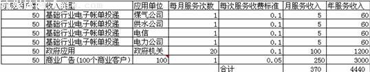 那么如果一家運營商已經(jīng)設(shè)計出了符合市場需求的業(yè)務(wù)模式,未來的盈利前景將會怎樣呢?不妨讓我們模擬分析一下。假設(shè)一個運營商擁有50萬左右的城市家庭用戶。在基礎(chǔ)行業(yè)領(lǐng)域,每月可以幫助煤氣、供水、電信和電力公司各發(fā)送1次賬單;在商業(yè)客戶方面,擁有百家左右的合作伙伴,每月每家合作伙伴發(fā)送1條短信廣告;在政府機(jī)關(guān)領(lǐng)域,粗略估算政府機(jī)關(guān)每月總計使用20次左右;每個家庭用戶則每月收到電信短信約125條。假設(shè)運營商的服務(wù)資費中,除了商業(yè)廣告為0.05元/條外,均為0.1元/條。那么,盈利情況又該怎樣呢?