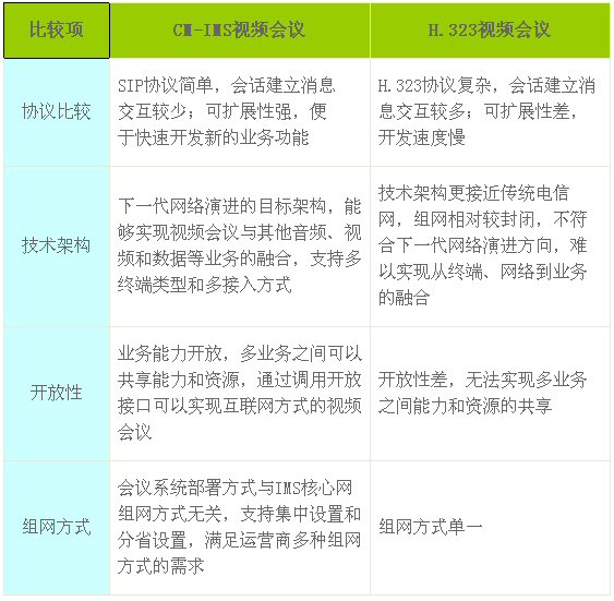 IMS是下一代網(wǎng)絡演進的核心技術(shù),基于中國移動CM-IMS的視頻會議在全面支持語音、視頻、數(shù)據(jù)會議和高清會議功能的同時,有效解決了傳統(tǒng)H.323會議系統(tǒng)互通性差、終端要求高、業(yè)務可擴展性低等問題,成為中國移動視頻會議發(fā)展的主流技術(shù)。CM-IMS的視頻會議與傳統(tǒng)的H.323會議相比,具有以下技術(shù)優(yōu)勢: