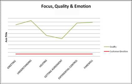 第二張圖片中客戶在很生氣的狀態(tài)下開始呼叫,而代理除了幫助階段外表現(xiàn)得都很好。該代理執(zhí)行的是最低績(jī)效標(biāo)準(zhǔn),但他對(duì)客戶的影響卻等于零。分析師提出了一個(gè)非常明顯而重要的關(guān)節(jié)——幫助是整個(gè)呼叫中最為重要的環(huán)節(jié)。這就是我們要做的事情。如果在幫助這一環(huán)上沒(méi)做好,那么其它環(huán)節(jié)如感謝客戶、問(wèn)候客戶等等都變得無(wú)足輕重。