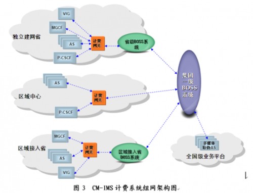 為了降低設(shè)備投資風險,CM-IMS在部署初期采用分省和區(qū)域中心相結(jié)合的組網(wǎng)方案,并設(shè)置全國級業(yè)務(wù)平臺。CM-IMS計費系統(tǒng)組網(wǎng)架構(gòu)如圖3所示。