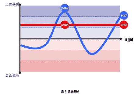 諾貝爾獎(jiǎng)得主心理學(xué)家Daniel Kahneman發(fā)現(xiàn)人們?cè)谝淮误w驗(yàn)中只會(huì)記住兩件事:峰值感受(流程中最好或最差的一點(diǎn))以及終了感受。我運(yùn)用“峰值——終了規(guī)則”將每個(gè)子流程上的情感感受按照自然時(shí)間順序連成一根“情感”曲線,如圖1所示。