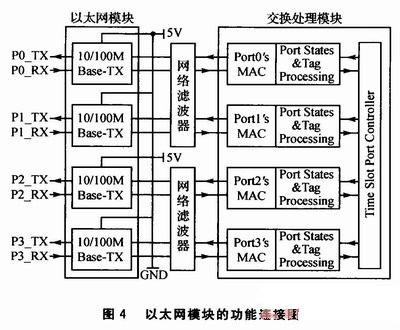 以太網(wǎng)模塊的功能連接圖如圖4所示,進(jìn)出以太網(wǎng)接口的信號(hào)都需要經(jīng)過網(wǎng)絡(luò)濾波器,網(wǎng)絡(luò)濾波器實(shí)質(zhì)上是一個(gè)選頻電路,它的功能就是允許某一部分頻率的信號(hào)順利的通過,而另外一部分頻率的信號(hào)則受到較大的抑制。與網(wǎng)絡(luò)濾波器相連的是交換處理模塊中的Port's MAC(M-edia Access Controllers),用來(lái)解決在共用信道中產(chǎn)生競(jìng)爭(zhēng)時(shí)分配信道的使用權(quán)問題。