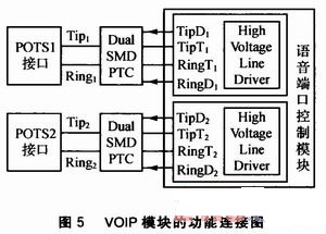 VOIP模塊的功能連接圖如圖5所示。Dual SMD PTC叫做雙重?zé)崦綦娮,可?duì)過熱和過流雙重作用導(dǎo)致的電路故障進(jìn)行保護(hù);Tip and Ring(正極線和負(fù)極線)表示組成電話配線電路的兩條電線,Tip是正極線的別稱,Ring是負(fù)極電線的別稱。